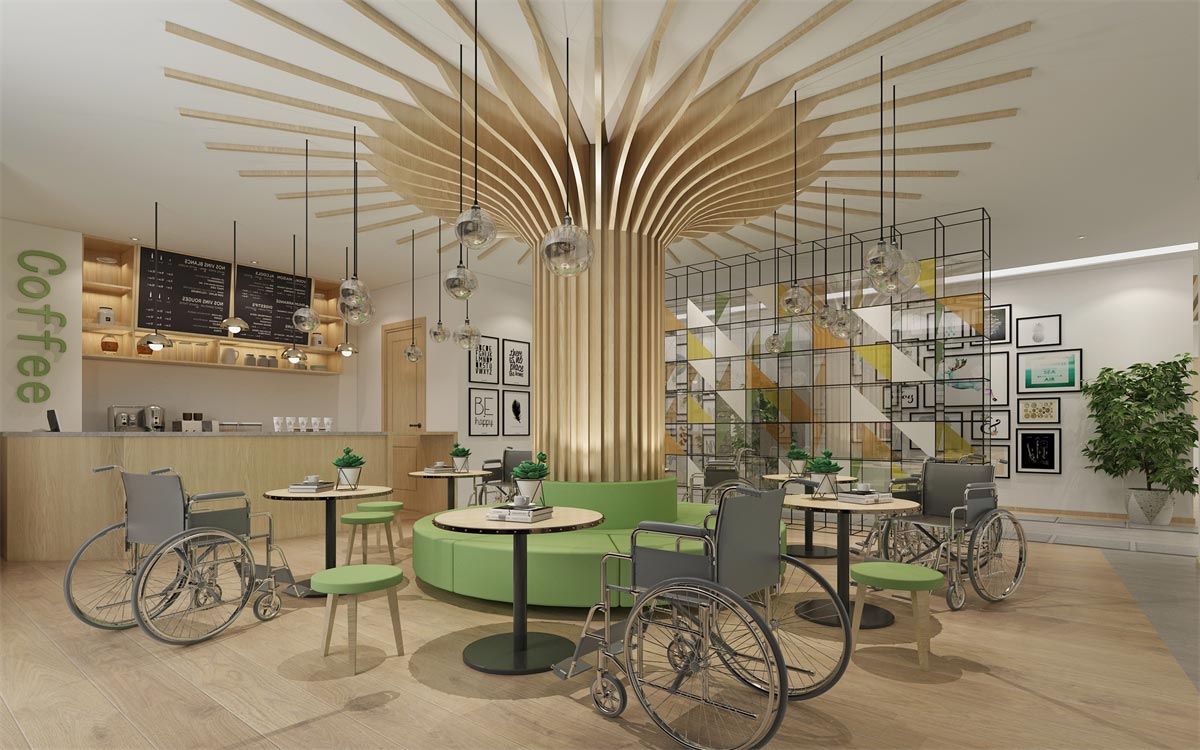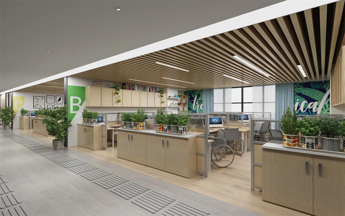 整個辦公室設計以關愛殘障人士為主題,采取綠色點綴,暖色為主的色彩搭配,表現辦公室溫馨而又充滿生機的辦公氛圍,從設計實景圖中可以看出,辦公環境表達對殘障人士的關懷和能力的認可與肯定。